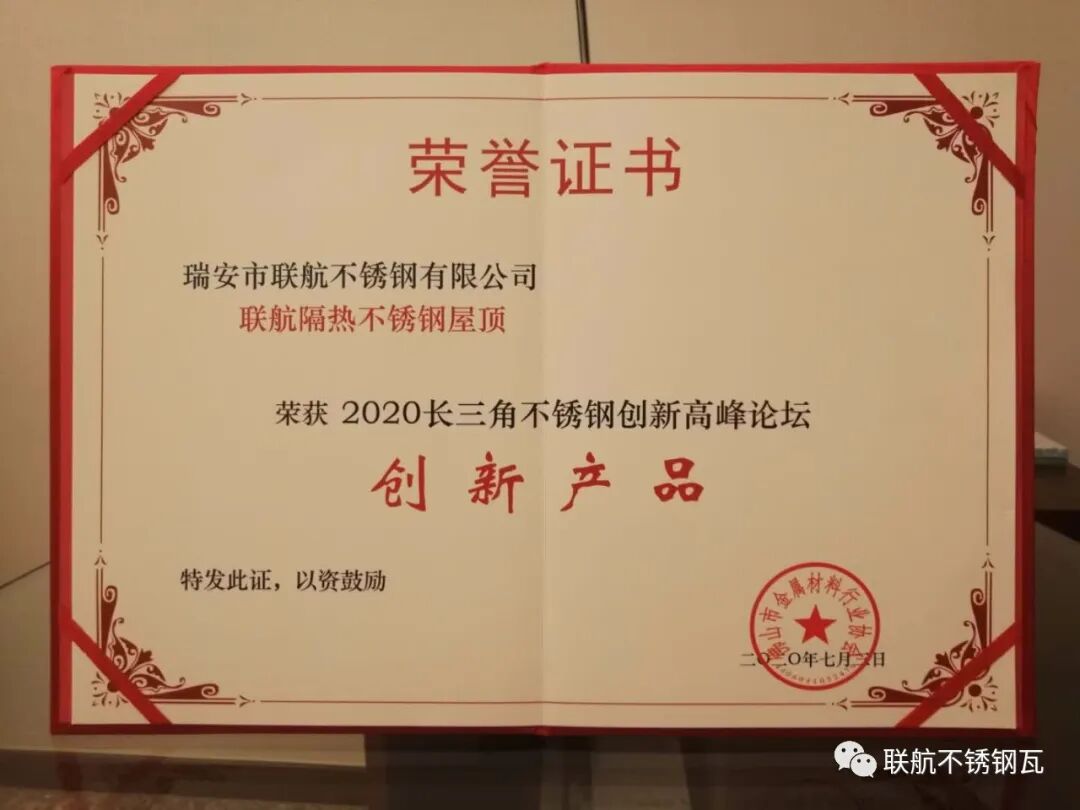 联航防腐隔热不锈钢屋顶瓦在2020长三角不锈钢创新高峰论坛中荣获“创新产品”奖。