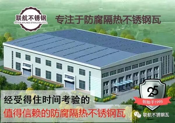 不锈钢屋顶是追赶时代节奏的建筑物优先选项,不锈钢建材是追梦未来发展的设计的美丽风景线。 联航防腐隔热不锈钢瓦——承载时代的荣耀与梦想,以新发明颠覆旧产品,实现从“彩钢瓦时代”向“隔热不锈钢瓦时代”的跨越,以优质品质书写“大者联航,创新高地”。