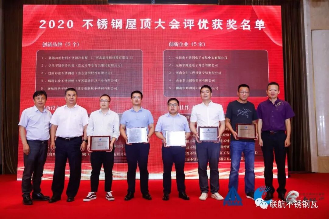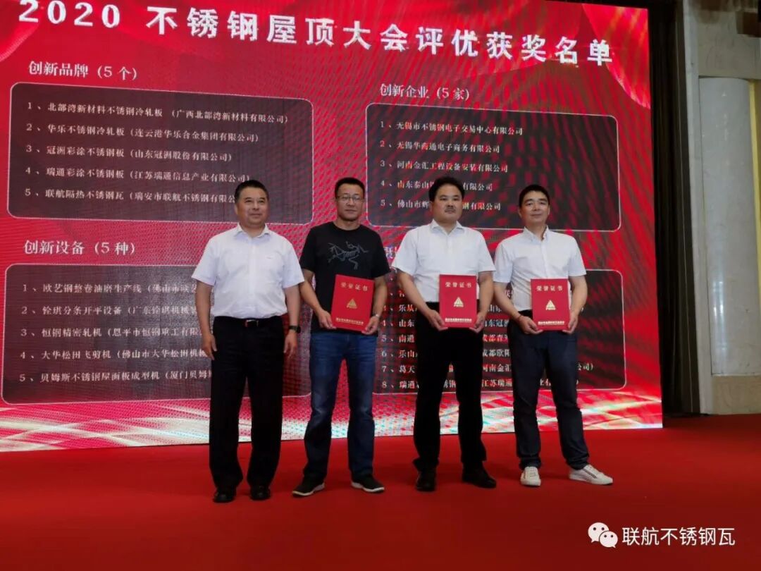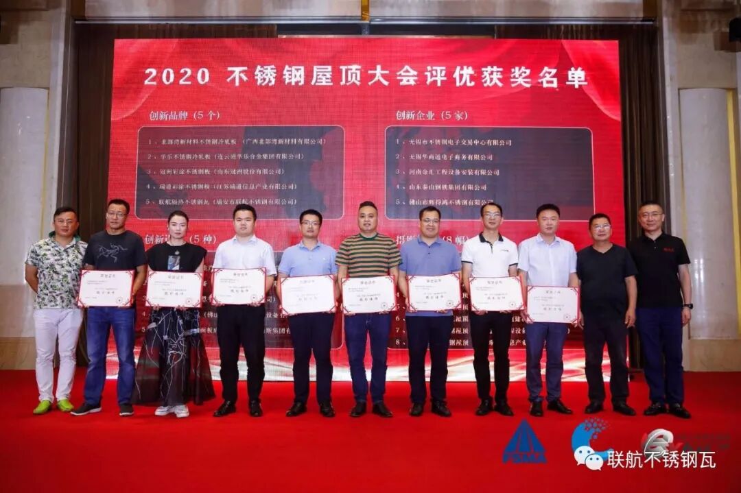 佛山市金属材料行业协会执行会长李强(兼任四川省川联不锈钢产业商会执行会长)主持了开幕式,发表了《2020中国不锈钢屋顶市场展望》主旨报告,并接受了无锡地区相关媒体的联合采访。会议上,协会颁发了“建筑屋面和幕墙用不锈钢压型板团体标准(T/FSMA 001-2020)参编单位”证书,“创新品牌奖”,以及“摄影佳作奖”等奖项。