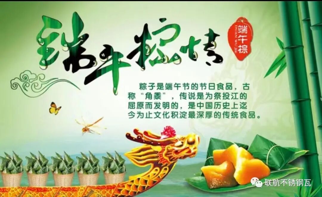 端午节又称“午日节、五月节、龙舟节、浴兰节”,是流行于中国以及汉字文化圈诸国的传统文化节日。端午节起源于中国,最初为古代百越地区(长江中下游及以南一带)崇拜龙图腾的部族举行图腾祭祀的节日,百越之地春秋之前有在农历五月初五以龙舟竞渡形式举行部落图腾祭祀的习俗。过端午节是我国两千多年来的传统习俗。 人生如粽,可咸可甜 南方喜食咸粽,北方则喜食甜粽 由于地域风俗不同 粽子也形成了南北差异化的风味 慢慢衍生出花样繁多的粽子口味 在不锈钢彩涂压型板行业也是一样 随着市场需求日益多样化 以及生产研发技术的不断革新 不锈钢彩涂瓦无论从色彩上 还是功能上都趋于多样化 生活无论咸甜 皆是万般美好 联航瑞玖顶品牌产品